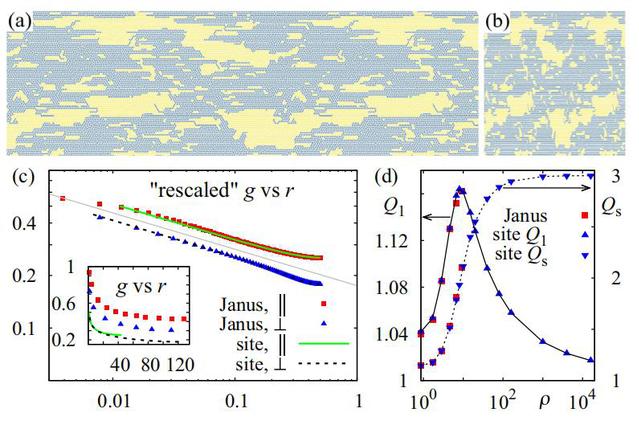 图1:三角晶格上双面神粒子系统条纹相中的逾渗与标准点逾渗的关系。(a) 处于临界逾渗状态的双面神粒子系统的条纹相位形,深蓝色的区域表示系统中的最大团簇,浅黄色区域表示团簇中的孔洞。(b) 把图(a)的横坐标作了一个尺度变换之后,系统变得具有各向同性。(c) 经过尺度变换之后,双面神粒子系统的临界关联可以跟点逾渗的临界关联很好地叠合在一起。(d) 双面神粒子系统的两个与团簇大小相关的无量纲物理量Q也可以很好地与点逾渗的叠合在一起。