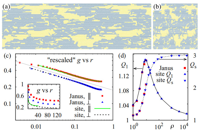 双面神粒子表面具有性质不同的两个区域,这类粒子在软物质物理领域很早就开始受到关注。现在这类粒子可以用许多不同的方法制备,被用作表面活性剂、微马达、显示材料、催化剂、生物传感器等等。双面神粒子能提供如此多的可能性主要依赖于它们非均匀的表面导致了各向异性的相互作用。利用这种独特的相互作用,可以获得新颖的自组装结构,例如胶束组成的气体、熵稳定的软晶体、取向有序的晶体等。然而,在双面神粒子组成的取向有序的系统中,长程连接性尚未被深入研究。长程连接性对于理解输运、力学、动力学等性质很重要。