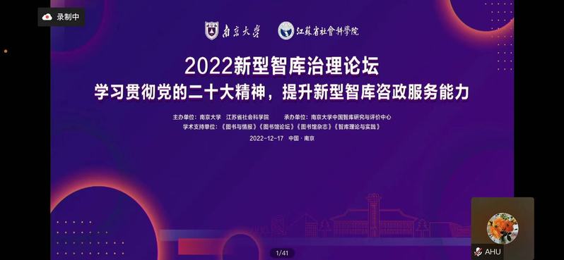 本网讯(人文社会科学处 刘晓耘)近日,由南京大学、江苏省社会科学院主办的“2022新型智库治理论坛”在南京以线下线上相结合的方式举行。论坛围绕“学习贯彻党的二十大精神,提升新型智库咨政服务能力”主题,共探新型智库在中国式现代化中的新担当新作为。论坛发布了CTTI 2022年度高校智库百强榜,安徽大学创新发展研究院第三次入选高校智库百强榜。
