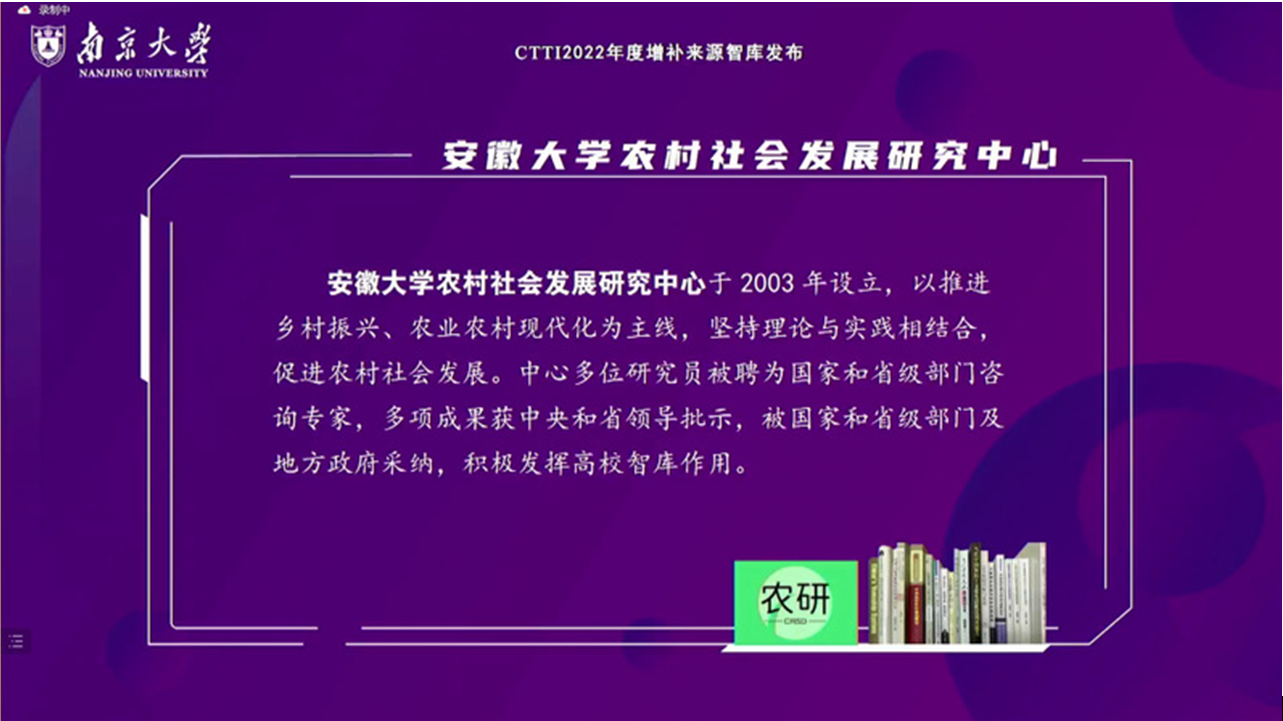 此外,在CTTI2022年度增补来源智库发布环节,安徽大学农村社会发展研究中心增补为CTTI2022年度来源智库。本年度CTTI来源智库目录增补86家,并经严格考评,清退已收录来源智库38家。截至目前,CTTI正式来源智库为989家。