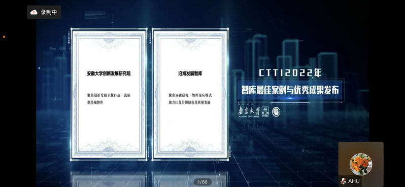 本次论坛还评选了智库建设最佳案例和智库研究精品成果。由安徽大学创新发展研究院选送的《聚焦创新发展主题 打造一流新型高端智库》获评CTTI 2022智库建设优秀案例、《安徽蓝皮书:安徽社会发展报告(2022)》《安徽推进长三角一体化应着力六个抓手》分别获评优秀成果一等奖、二等奖。