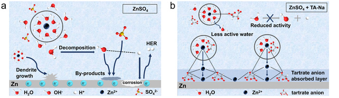 图1. (a)锌负极在硫酸锌电解液中发生副反应,(b)锌负极在含有酒石酸钠电解液中副反应得到抑制。