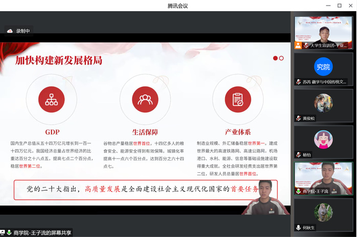 大学生宣讲团成员王子流通过介绍“过去五年的工作和新时代十年的伟大变革”中的发展成果,解释了党的二十大报告中强调“高质量发展是全面建设社会主义现代化国家的首要任务”的原因,结合个人经历,对报告中关于民营经济的阐述进行讲解,展现了安徽民营企业在推动国家新发展格局中所发挥的巨大作用。