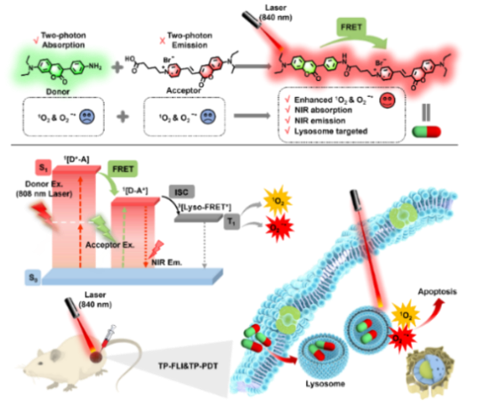 (1)基于双光子激发的分子内荧光共振能量转移机制,巧妙利用分子裁剪和拼接方法,设计制备了有机光敏剂(Lyso-FRET),实现了荧光能量的再利用,提升光敏化性能,在H22荷瘤小鼠体内优异的癌症治疗效果,同时为研究分子内相互作用开发光敏剂提供新的思路。