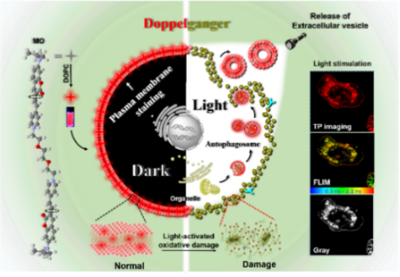 (2)通过系统性地优化和评价,引入柔性醚氧链,制备了具有优异的质膜靶向特性(黑暗条件下)的双香豆素-吡啶盐衍生物MO。此外,MO对质膜的主要成份磷脂展现出2.43 ns的寿命延长,为细胞水平利用荧光寿命成像显微镜监控膜的微环境改变提供了可能。利用MO能够实现光控氧化损伤中质膜动力学的原位监控,主要包括自噬体-凋亡体的衍生以及分离(光照条件下)。