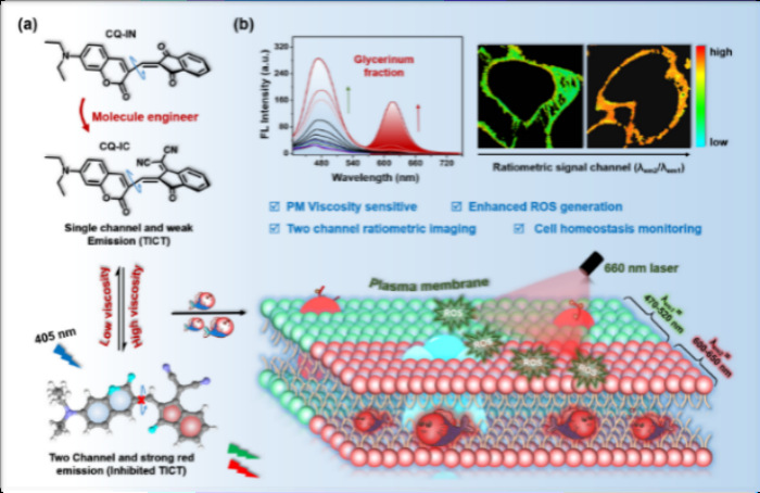 (3)巧妙地调节电子受体,设计和制备一种光激活的荧光探针,基于双通道比率成像模式实时分析和监测质膜的微环境稳态。