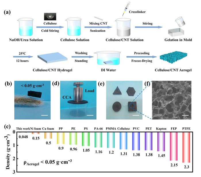 图1:纤维素碳纳米管气凝胶的制备与表征。(a) CCA的制备工艺示意图。(b) CCA的超轻特性。(c)量化常见摩擦材料的密度。(d) 1200g载荷下CCA依然保证原状。(e-f)不同形状的CCA照片及其表面SEM图像。
