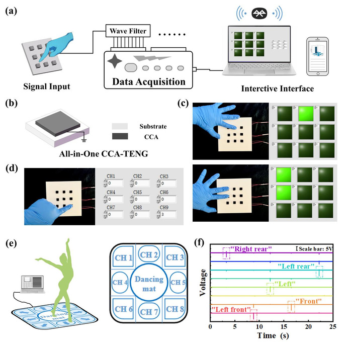 图2:基于CCA-TENG的多通道人机交互传感及其应用。(a)多通道传感器的示意图,包括CCA-TENG、数据采集和LabVIEW。(b)基于单电极模式的All-in-One CCA-TENG。当手指触摸传感器单元时,传感器阵列和灯泡(c)以及计数器(d)的图像。(e)自供电跳舞垫示意图和方向对应的装置示意图。(f)当调节器移动到相应位置时,每个通道的电压信号。