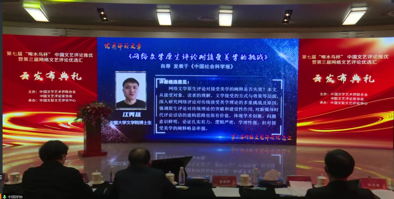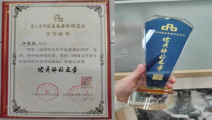 我校2020级中国现当代文学专业博士研究生江秀廷同学(导师:周志雄教授)凭借论文《网络文学原生评论对接受美学的挑战》(原作发表于《中国社会科学报》2022年8月1日),获得第三届全国网络文艺评论优选汇长评类优秀评论文章。优选汇由中国文联、中国文艺评论家协会主办,是中国网络文艺最高行业评价活动。