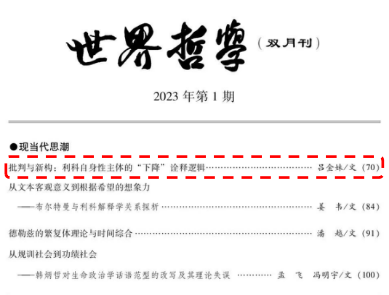 本网讯(哲学学院 孟星星) 近日,我校哲学学院2020级博士研究生吕金妹于2023年第1期《世界哲学》杂志发表文章《批判与新构:利科自身性主体的“下降”诠释逻辑》。该生师从哲学学院张能为教授,研究方向为语言哲学与解释学,文章聚焦于法国哲学家保罗·利科的解释学研究,文理清晰地介绍了利科对于主体性的论述。
