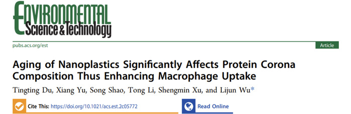 本网讯(物质科学与信息技术研究院 吴李君)近日,环境领域国际顶级期刊《Environmental Science & Technology》以Supplementary Cover的形式,在线发表了安徽大学物质科学与信息技术研究院环境所杜婷婷副教授、吴李君教授等题为“Aging of Nanoplastics Significantly Affects Protein Corona Composition Thus Enhancing Macrophage Uptake”的研究成果。杜婷婷副教授为论文第一作者,硕士研究生余翔、邵松以及李通博士、徐升敏副教授为共同作者,吴李君教授为通讯作者,安徽大学为唯一完成单位。