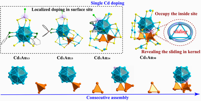 该系列团簇具有持续组装的内核,它们是由一个二十面体结构单元分别与0至3个四面体单元组装而成。重要的是通过调控四面体单元的持续组装,实现了Cd原子逐渐从团簇外围到内核的迁移。对比内核的Cd原子与表面Cd原子的掺杂行为,表面的定位掺杂对比内部的分散占据,确定了镉原子在团簇内部分散的掺杂行为可能是取决于团簇内核中金属的流动性。最后借助DFT理论计算,验证了Cd原子在团簇内部的“流动性”是一个能量有利的过程。因此,该工作不仅为金属原子的“流动性”提供了实验证据,而且也为实现纳米团簇内核的定向/可控组装提供了新的见解。
