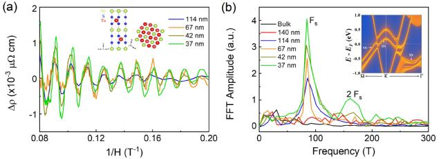 图1. (a)不同厚度SnTaS2纳米片的SdH量子振荡, 插图为SnTaS2结构。(b) 不同厚度SnTaS2纳米片SdH量子振荡的频率与幅度。插图是理论计算的能带结构,白色箭头标注的是二维拓扑表面态。