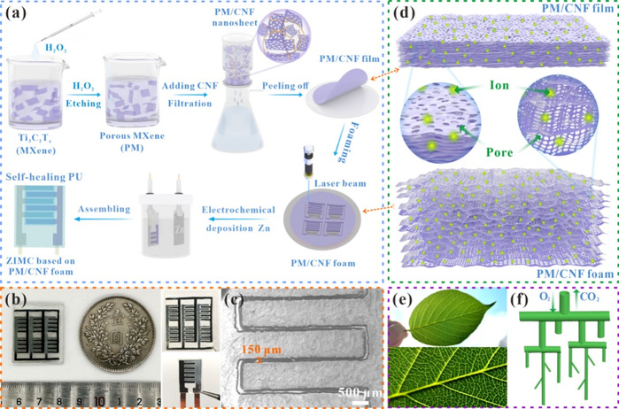 在以上大量研究工作的基础上,他们近期受自然界普遍存在的默里定律的灵感激发,即生物体百年来进化出的高度分级结构用以实现有效扩散和最大化传质,构筑了跨微-介-大孔分级互连的多孔MXene电极(图1)。基于该MXene电极的锌离子微电容器表现出高达410 mF cm-2的面积比电容,且在2100 µW cm-2的功率密度下,实现了高达103 µWh cm-2的能量密度。本文为电极材料(不限于MXene)实现超短的离子扩散通道和最大的传输效率提供了一个有效的策略,可用于下一代高性能能量存储。相关研究成果以“Nature-Inspired Interconnected Macro/Meso/Micro-Porous MXene Electrode”为题在国际期刊 Advanced Functional Materials上发表。