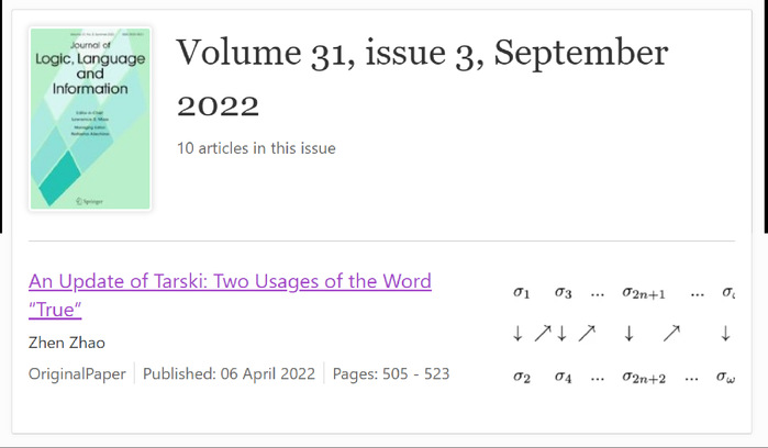 本网讯(哲学学院 孟星星)近日,哲学学院赵震副教授在国际期刊Journal of Logic, Language and Information上发表文章“An Update of Tarski: Two Usages of the Word ‘True’”。该刊是欧洲逻辑、语言与信息协会(European Association for Logic, Language and Information)会刊,同时被SCI和A&HCI收录,是逻辑学国际著名期刊,在SCIMAGO期刊排名中长期处于Q1。该刊为季刊,全年发文量不超过30篇。