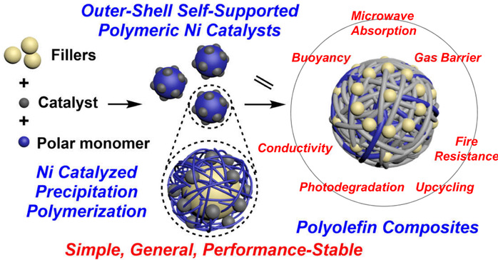 近日,我校谭忱讲师与中科大陈昶乐教授合作,制备了一系列壳层自负载型镍系烯烃聚合催化剂,通过α-二亚胺镍催化的离子簇型极性单体的沉淀聚合反应,在各种载体的表面上“沉积”了一层含有镍催化剂活性物种的聚烯烃离聚物壳层。这一策略使得催化剂分子与载体的表面之间不再有分子水平上的相互作用,削弱了载体种类对催化剂性能的影响,从而避免催化剂性能在负载后出现难以预测的改变。该类核壳型催化剂在乙烯单体的淤浆聚合、气相聚合中表现出高聚合活性、高分子量和可调节的熔点及支化度。与熔融共混法相比,通过原位聚合法得到的聚烯烃复合材料具有显著提升的机械性能,并在废弃物利用、浮力材料、电磁功能、阻燃、光降解聚合物等方面表现出优异的定制性能。此外,研究表明,除了填料的均匀分散之外,材料性能的改善还与较强的基体-填料界面相互作用有关。这种较强的相互作用得益于极性单体组分的增容作用。此外,该类镍催化剂还实现了良好的产物形貌控制,避免了聚合过程中的粘釜问题。