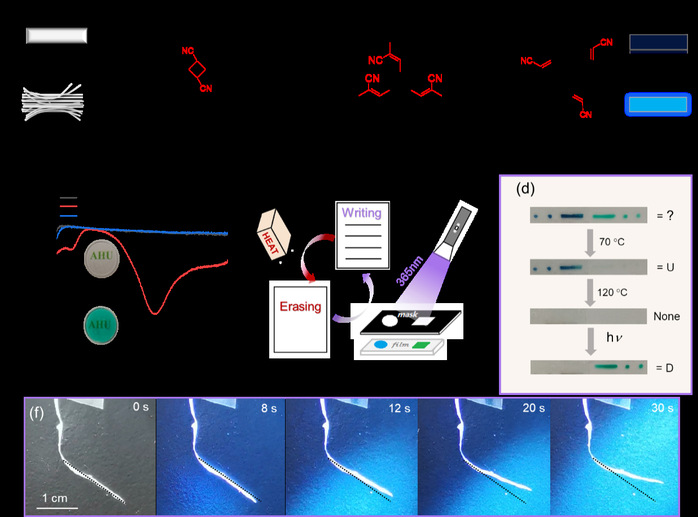 本网讯(物质科学与信息技术研究院 )由于光能具有绿色环保、远程可控、瞬时性等优异的特性,光响应功能材料成为智能材料领域研究的热点。然而现在大多的研究都聚集在单一的光响应系统上,实现多重可控的光响应系统仍然是一个难点。基于此,我校物质科学与信息技术研究院魏培发教授团队设计了一个基于三臂氰基苯乙烯衍生物的双重可控的光响应体系,通过调控分子间和分子内不同的光反应,成功实现了可控的光致机械运动行为和光致变色行为(图1)。