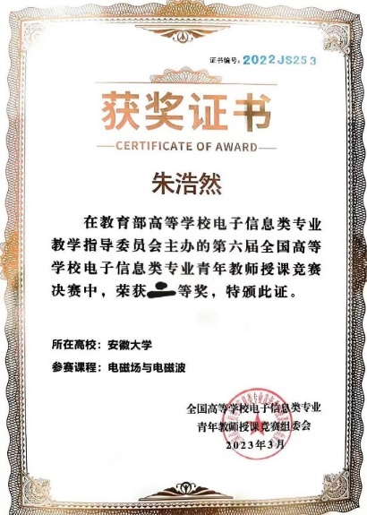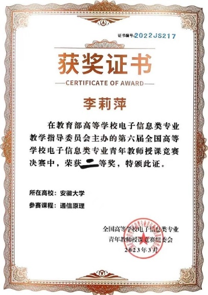 本网讯(电子信息工程学院 倪梦遥)2023年3月25至26日,由教育部高等学校电子信息类专业教学指导委员会主办的第六届全国高等学校电子信息类专业青年教师授课竞赛在重庆邮电大学举行。我院通信工程系李莉萍老师(参赛课程《通信原理》)、朱浩然老师(参赛课程《电磁场与电磁波》)在获华东赛区一等奖之后,最终获得此次赛事二等奖。