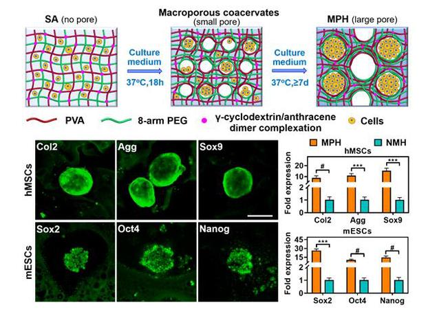 基于此,杨雪峰老师与合作者提出了一种凝聚层-水凝胶转变策略,通过γ-环糊精和蒽二聚体间主-客体作用所形成的超分子组装物(SA)的凝聚作用,制备出孔径为~100 μm的 MPH。SA网络中弱且可逆的超分子交联作用赋予其类似液体的流变性能,这不仅使得SA具有可注射性,而且有利于其在生理介质中形成大孔凝聚体并最终向MPH转变。与具有相同初始力学性能的无孔静态水凝胶相比,MPH优异的结构动态特性(来源于SA)和细胞相容的孔形成过程,可以更好地支持所封装小鼠胚胎干细胞和人间充质干细胞的成球化生长和自我更新,从而显著促进其干性保持和软骨分化。这种具有自进化多孔结构的、可注射和细胞相容的MPH,在细胞/类器官培养、细胞器模拟、药物/细胞传递和组织再生等生物医学领域具有广阔的应用前景。