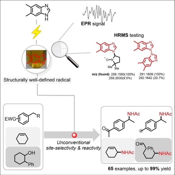 该工作以苯并咪唑为前体通过电氧化生成一系列结构明确的氮自由基,并利用电子顺磁共振(EPR)、紫外线和可见光(UV-vis)光谱和高分辨质谱(HRMS)等测试手段对氮自由基表征。基于氮自由基的高催化活性,该团队以其作为选择性的氢原子转移(HAT)催化剂,实现了一些系列的C(sp3)-H键胺化反应。该方法弥补了传统胺化反应的不足,对于强缺电子底物表现出特殊的催化活性,更重要的是该方法具有独特的位点及化学选择性。自由基的催化模式也被该团队进一步拓展到烯丙基C(sp3)-H和醇的β-C(sp3)-H的胺化、Si-H的氧化以及Minisci-type反应。这项工作为电化学自由基催化转化方面提供一个新的思路。据悉,该团队目前已在电合成方面取得多个突破性成果(Nat. Synth. 2022, 1, 417-419; CCS Chem. 2022, 4, 1938-1948)。