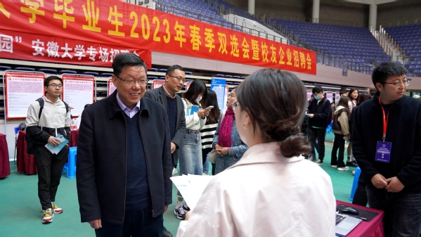 本网讯(融媒体中心 蔡丽丽 李大为)4月7日上午,安徽大学毕业生2023年春季双选会暨校友企业招聘会在磬苑校区体育馆举办。校党委常委、副校长周飞巡看现场,看望校友企业代表,现场指导招聘工作。