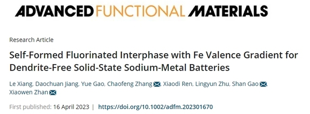 相关成果以“Self-formed fluorinated interphase with Fe valence gradient for dendrite-free solid-state sodium-metal batteries”为题发表在材料学科国际顶级期刊《Advanced Functional Materials》上,安徽大学2021级硕士研究生向乐和材料科学与工程学院江道传老师为本文共同第一作者,詹孝文、高山、张朝峰教授为通讯作者,安徽大学为第一/唯一通讯单位。