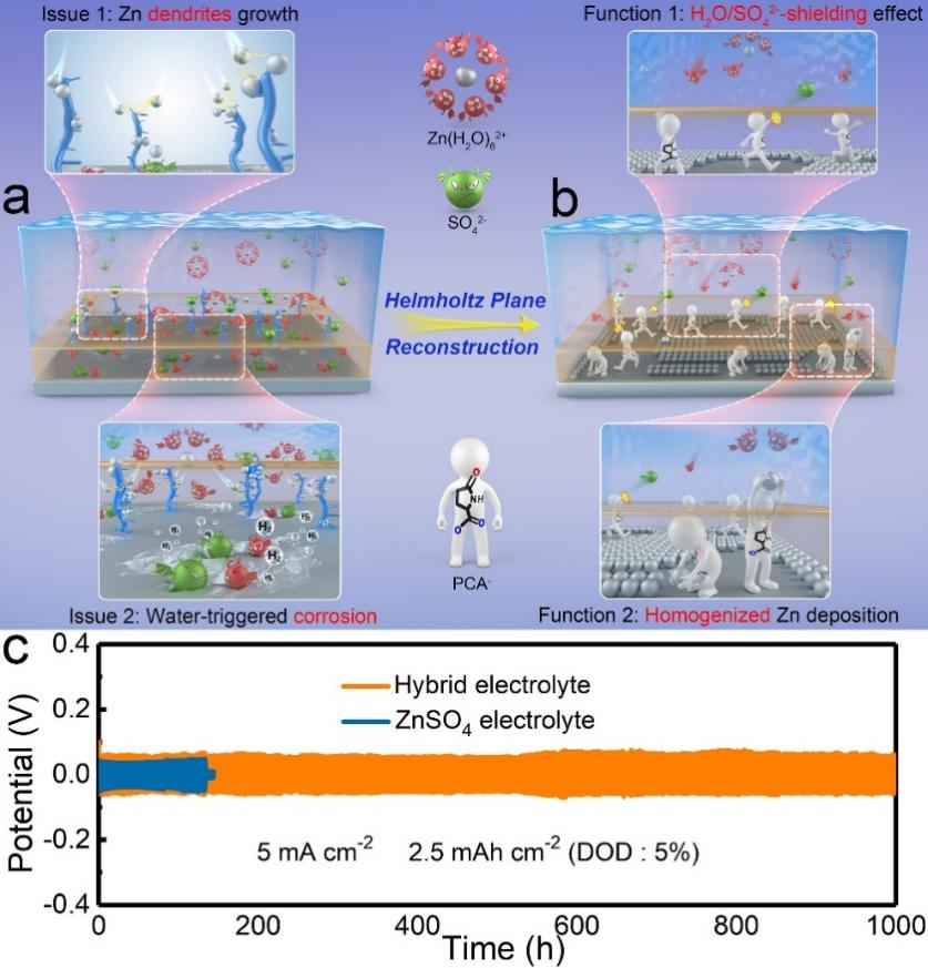 锌金属阳极(zinc metal anode, ZMA)上的枝晶增生和寄生副反应严重削弱了水系锌金属电池(aqueous zinc metal batteries, AZMBs)的能量效率。针对上述问题,我校材料科学与工程学院胡海波教授与香港理工大学姚海民教授、傅济民博士合作提出了锌阳极表面的亥姆霍兹层(HP)重构策略。系统实验和计算模拟表明,通过吡咯烷酮羧酸锌 (PCA-Zn)的微量添加,解离出的具有双亲锌末端的PCA−阴离子会优先附着在ZMAs表面,羧基作为锚点取代H2O和SO42−,形成排斥H2O和SO42−的HP以抑制水触发的副反应(图1b)。同时,PCA−阴离子的另一游离亲锌羰基末端使在ZMA表面重组后的HP对Zn2+具有强烈的空间约束作用,有效抑制了Zn沉积过程中无序的平面内扩散,同时起到了均匀化锌离子通量的作用(图1b)。受益于能够实现更稳定的ZMA/电解质界面化学的多功能HP,在放电深度5%时,组装的Zn||Zn对称电池电镀/剥离循环耐久性超过1000小时,相同条件下,纯硫酸锌电解液只能实现135 h的循环寿命。