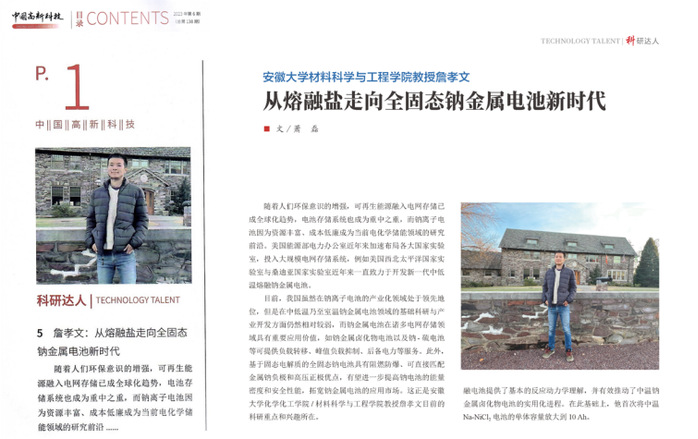 本网讯(材料科学与工程学院 周乾坤)近日,由科技部主管、中国科技产业化促进会主办的《中国高新科技》期刊编辑部专访我校材料科学与工程学院詹孝文教授,并在最新一期(2023年第6期)首页“科研达人”版面以“从熔融盐走向全固态钠金属电池新时代”为题报道詹孝文教授回国前后主要科研进展。