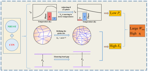 在Na0.5Bi0.5TiO3-SrTiO3固溶体中,通过引入B位自缺陷的线性电介质CaTi0.875Nb0.1O3,调控能带间隙和三方相(R3c,R相)与四方相(P4bm,T相)之比例,获得了优异的储能性能(Wrec=7.13 J/cm3、储能效率ƞ=90.3%、充放电时间 t0.9 = 25 ns)以及良好的温度(在233-413K温度范围内, DWrec≤7%,Dƞ≤10% )及频率稳定性。该工作以“Phase and band structure engineering via linear additive in NBT-ST for excellent energy storage performance with superior thermal stability”为题,发表于材料学科著名期刊《ACS Applied Materials & Interfaces 》。该工作是和安徽大学电镜中心葛炳辉、宋东升教授、温州大学张鉴教授,澳大利亚卧龙岗大学程振祥教授等多个课题组合作共同完成的,材料科学与工程学院博士研究生曹文军和物质科学与信息技术研究院硕士研究生林仁菊为本论文共同第一作者,安徽大学为论文第一通讯单位。