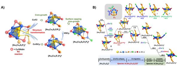 原子精确的纳米团簇的尺寸转化能有效地阐明结构-性质间的构效关系,为功能化修饰/调控簇合物的结构提供了有效的指导作用。然而尺寸转化过程中反应中间体的难获取致使了解尺寸转化过程的细节仍然面临挑战。基于此,安徽大学先进材料原子工程中心构建了小尺寸金铜纳米团簇的尺寸转化体系,通过铜盐CuCl诱导团簇发生尺寸转化来探究其机理。空间位阻较小的CuCl和CuSCy可以容易地填充到模板簇合物Au4Cu4簇合物的空腔中,完成核心生长,形成Au4Cu5框架,但体积较大的CuSAdm则难以有效填充。在形成Au4Cu5稳定框架后,表面覆盖完成尺寸再增长,形成Au4Cu6。通过电喷雾质谱的实时追踪,借助DFT计算,验证了整个转化过程:添加CuCl、核心结构互变异构、Cl-迁移、二次添加[CuCl]和[CuCl]-[CuSR]交换五个步骤。该工作初步揭示了Cu(I)诱导金铜合金团簇的结构转变机理,丰富了金属离子诱导金属纳米团簇尺寸转换的研究。