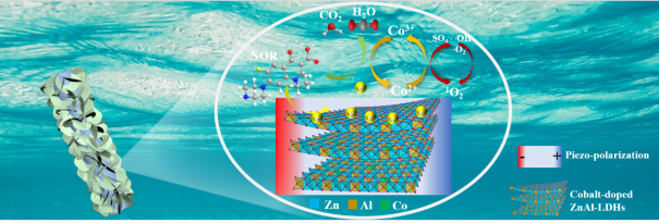 图1 钴掺杂的ZnAl-LDH纳米片阵列压电催化剂活化过氧单硫酸盐降解诺氟沙星的示意图