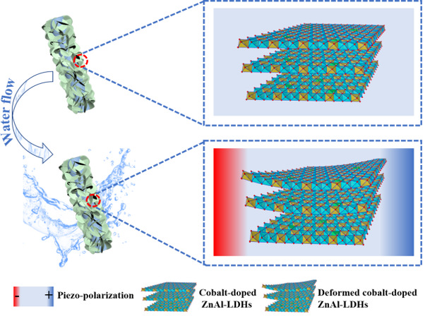 图2 钴掺杂的ZnAl-LDHs在水流诱导下的内部压电极化示意图