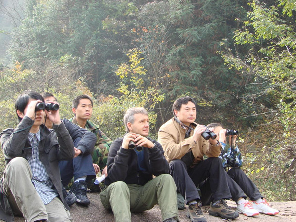 李进华(右一)与美国华盛顿大学国家灵长类研究中心教授Randall C. Kyes(中)在黄山合作研究