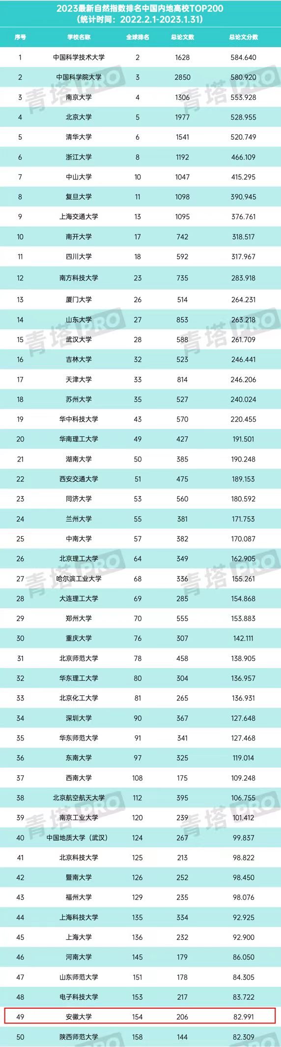 本网讯(宗禾)6月2日,自然指数官网更新自然指数排名数据(统计时间节点为2022.2.1-2023.1.31)。其中,安徽大学以82.991的分值,位居内地高校第49位,全球高校排名位居第154位。