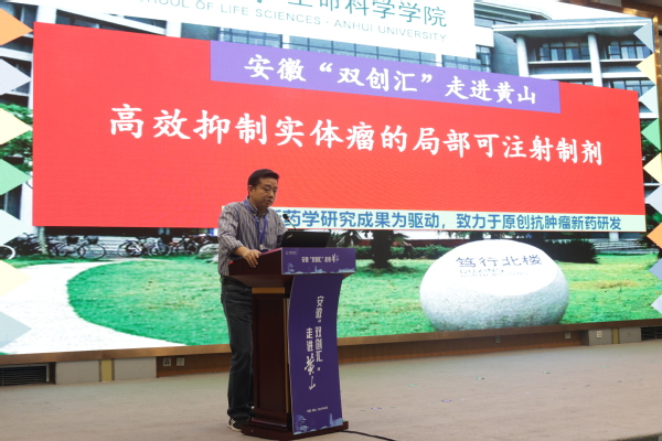 5月28日上午,安徽省科技厅与黄山市人民政府联合举办安徽“双创汇”•走进黄山专场活动,安徽大学黄山技术转移中心协办,校党委常委、副校长周飞应邀带队参会。安徽大学生命科学学院唐汝培教授发布成果“高效抑制实体瘤的局部可注射制剂”,受到高度关注。