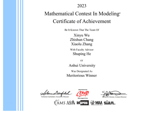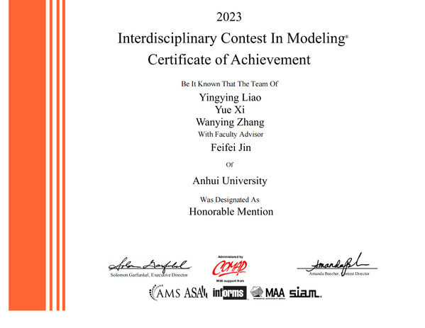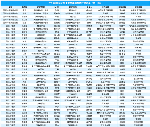 本网讯(数学科学学院 周礼刚)2023年国际大学生数学建模竞赛第一批成绩日前出炉,我校学子发挥出色,续写近年来的优异成绩,获奖数量和质量取得双突破,获国际特等奖提名奖(Finalist)5项,国际一等奖(Meritorious Winner)8项,国际二等奖(Honorable Mention)25项。按获奖最高等级奖项数量排序,我校位列全国并列第36名(大陆地区,不含港澳台地区)。获奖学生来自学校14个学院,共计114人。
