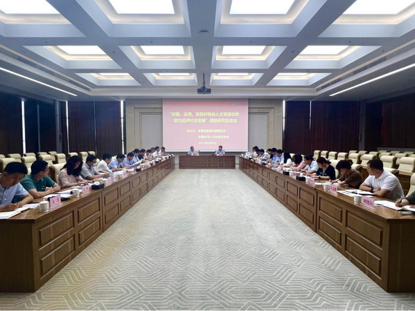 本网讯(融媒体中心 廉多日娜)6月9日,“挖掘、运用、发扬好我省人文资源优势,助力经济社会发展”课题研究工作启动会议在磬苑校区材料科学大楼 A101 会议室召开,会议由省委宣传部理论处、安徽大学人文社会科学处主办。省委宣传部理论处处长、一级调研员唐国富主持。安徽大学党委常委、副校长孙长银出席并致辞。皖西学院党委书记袁维海,安徽艺术学院党委副书记、院长樊嘉禄,淮北师范大学副校长余敏辉等出席。