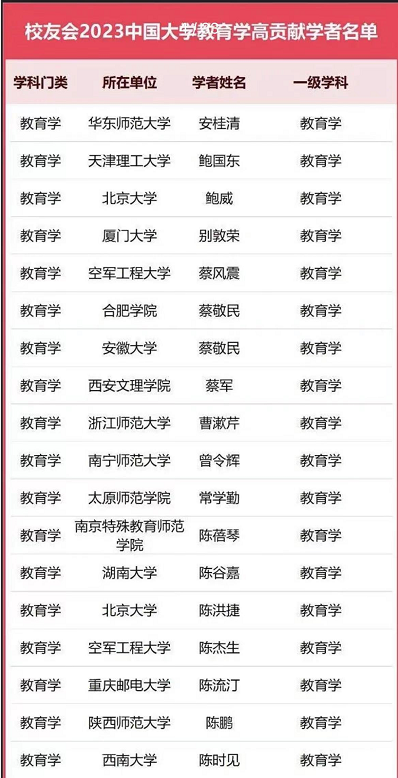 本网讯(人文社会科学处) 2023年6月8日,全国第三方大学评价研究机构艾瑞深校友会网最新发布校友会2023中国高贡献学者榜单,高校教育学门类共有潘懋元、顾明远、林崇德、钟秉林、叶澜、刘海峰等499名杰出学者入选,我校蔡敬民教授名列其中。校友会中国高贡献学者榜单首发于2022年,是目前国内唯一从“教学科研贡献”角度遴选中国高校优秀学者的榜单。中国高贡献学者遴选以中国学者对国家经济社会发展做出的系统性成就和贡献为基准,从教育教学、学术研究和社会服务等多个角度19项评价指标遴选中国高校的杰出学者,这是与中国高被引科学家、高被引学者仅从纯论文影响角度评价学者最大的不同。