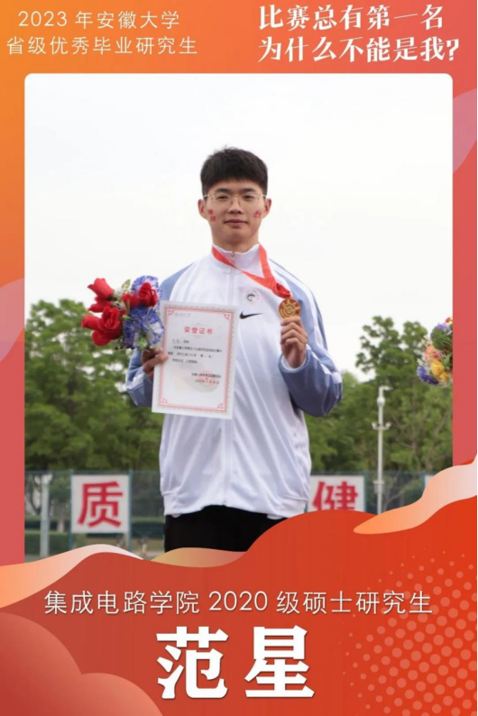 本网讯(融媒体中心)范星,2021年优秀研究生,集成电路学院2020级硕士研究生,在校期间获2022年荣获优秀研究生标兵,2021年荣获优秀共青团员,2020年-2022年研究生学业奖学金,2021年安徽省田径比赛4×100接力银牌、200米铜牌,安徽省第十五届运动会4×100接力银牌,安徽大学第五十九届运动会乙组男子100米、200米金牌。发表SCI论文一篇,一篇专利已实审。