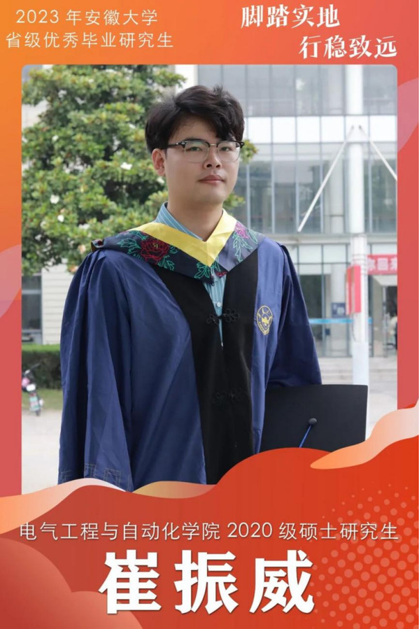 本网讯(融媒体中心)崔振威,电气工程与自动化学院2020级硕士研究生,曾获 2020年—2022年研究生学业一等奖学金,2022年第八届中国国际“互联网+”大学生创新创业大赛全国银奖、安徽省金奖,2021年第七届中国国际“互联网+”大学生创新创业大赛全国铜奖、安徽省金奖,发表1篇论文,申请专利3项和软著1项,2023年安徽省研究生党员标兵,2022年安徽省大学生年度人物,入围第十七届“大学生年度人物”,2022年安徽省研究生创新创业之星,2021年优秀研究生标兵。