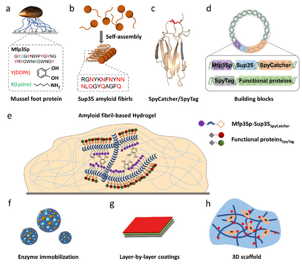 该工作是在贻贝粘蛋白和酵母朊蛋白的序列与结构的基础上,通过理性设计,构建三元重组融合蛋白作为自组装元件,制备出具有良好黏附性能的水凝胶材料。理化性质分析表明,制备的水凝胶材料不仅具有淀粉样纳米纤维网状结构,同时具备贻贝粘蛋白的黏附性能,并且展现出良好的稳定性。此外,SpyCatcher/SpyTag化学融合策略的引入,使得水凝胶材料的功能化更加简单和高效。经过功能化的蛋白可以用于酶固定化、多层组装膜材料以及生物支架等,充分显示了其在生物制造以及生物医学等领域的潜在应用价值。而该研究运用的方法和策略,也有望被应用于其他蛋白质基纳米材料。