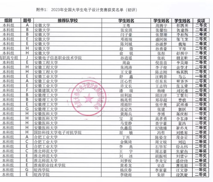 2023年全国大学生电子设计竞赛安徽赛区各校上报参赛队伍数482队,参赛学生1446人,全国奖获奖队数量不超过全国实际参赛队总数的8%。其中,由集成电路学院郭小辉副教授等教师指导的两支队伍(第一队:张安琪、张馨怡、贺建伟;第二队:闫子豪、张慧珊、李相辉)荣获全国二等奖。