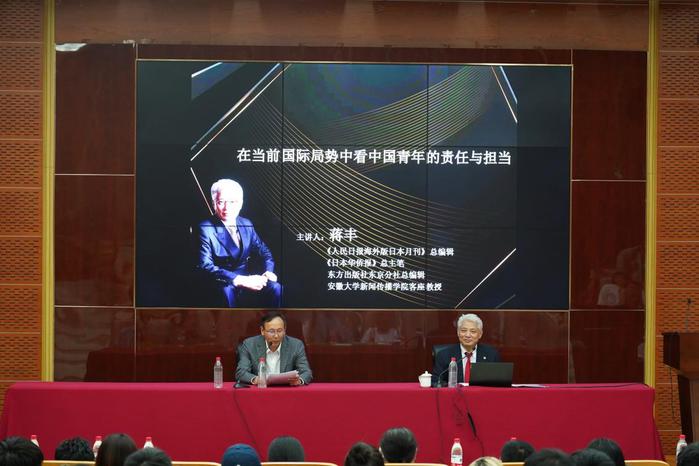 本网讯(融媒体中心 叶澳华)2023年9月14日晚,省侨联海外专员、特聘专家、日文版《人民日报海外版日本月刊》总编辑蒋丰教授在安徽大学文典阁学术报告厅应邀为我校师生作了题为《在当前的国际局势中看中国青年的责任与担当》的学术讲座。讲座由安徽大学国际合作与交流处处长胡学文主持。