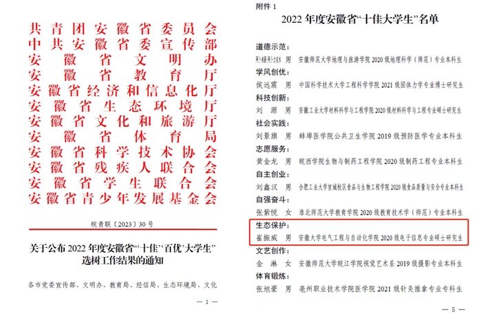 本网讯(校团委 电气工程与自动化学院 燕瑞)近日,共青团安徽省委员会、省委宣传部、省教育厅等12家单位联合发文公布了2022年度安徽省十佳大学生名单,电气工程与自动化学院崔振威同学成功入选。