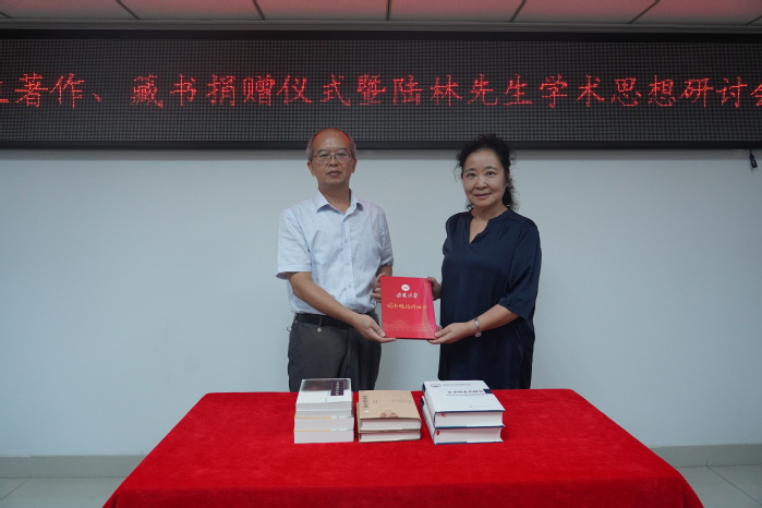 本网讯(融媒体中心 蔡丽丽 方琦)9 月 20 日上午,陆林先生著作藏书捐赠仪式暨陆林先生学术思想研讨会在磬苑校区文典阁图书馆举行。这次捐赠的著作、藏书是陆林先生从1975年到2015年四十年收藏的成果。陆林先生的3275册著作和藏书以及存放这些书籍的书柜都捐献给母校,给母校95岁生日献上厚重礼物。陆林先生夫人杨辉;陆林先生兄长林陆;陆林先生同学,安徽大学原校长、书记,清华大学教授黄德宽出席并讲话。校党委常委、副校长周飞出席陆林先生著作藏书捐赠仪式并讲话。陆林先生的同学、弟子及其相关研究领域的专家学者参加会议。活动由文学院、校友工作与基金事务办公室和图书馆主办。