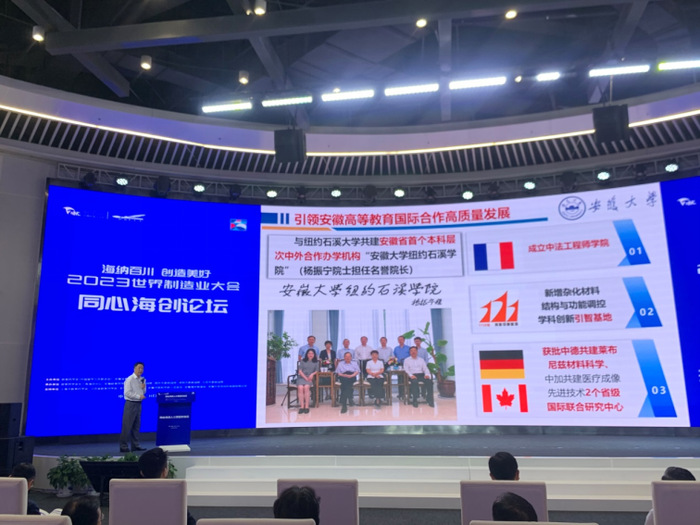 本网讯(学校办公室 满德龙)9月20日下午,2023世界制造业大会“同心海创人才项目对接会”举行。省委常委、统战部部长张西明,欧美同学会副会长、全国政协常委、中国科学院院士李林出席并致辞。大会由安徽省委统战部常务副部长张永主持。校长匡光力受邀出席并作《安徽大学助您来皖创业》主题演讲,材料科学与工程学院副院长张惠代表学院与企业签约。