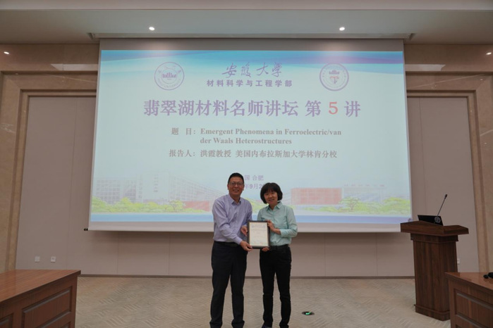 本网讯(融媒体中心)9月26日上午,材料科学与工程学部主办的翡翠湖材料名师讲坛第五讲在材料科学大楼A101报告厅举办。美国内布拉斯加大学林肯分校洪霞教授作“铁电/范德华异质结中的新奇现象”学术报告。校党委常委、副校长王守国主持会议,并为洪霞教授颁发了“翡翠湖材料名师讲坛第5讲”荣誉牌。