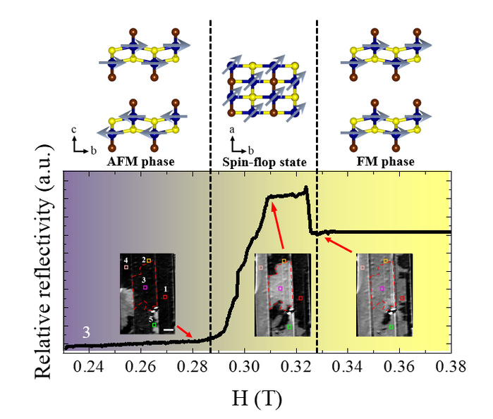 针对这个问题,我校王守国教授团队的杨蒙蒙教授使用磁光克尔显微镜研究了范德瓦尔斯反铁磁材料CrSBr 的AFM-FM转变,并发现与不同磁态(铁磁、反铁磁或顺磁态)相关的反常磁光各向异性。此外,利用这种独特的磁光特性实现了对AFM Néel矢量方向和加外磁场导致的AFM- FM跃迁的动态过程直接成像,研究了AFM-FM转变过程中的spin-flop态。CrSBr中独特的磁光特性和对AFM-FM相变动力学过程的清晰成像表明了范德瓦尔斯磁性材料在未来自旋电子技术中的前景。