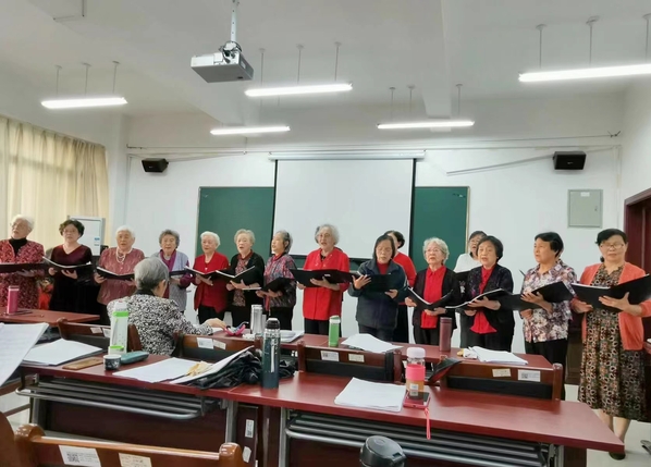 本网讯(离退休工作处)10月17日下午,在全国第十一个“老年节”来临之际,安徽大学老年大学晚晴合唱团在龙河校区教工活动中心203教室举办“秋之韵”演唱会。在92岁的岳巧云老师领唱下,全体团员合唱《我爱你中国》,歌声高亢嘹亮,拉开了本次演唱会的序幕。