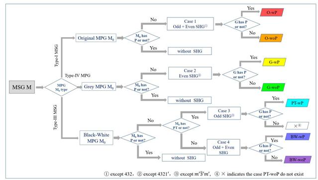 图2 磁有序材料SHG效应分类的流程图。首先,由磁空间群(MSG)确定磁点群(MPG)。其次,根据MPG的对称性将SHG效应的张量分为四种情况(Case 1-4)。最后,根据母相是否具有反演对称性(wP、woP)确定磁有序材料的SHG类型(右侧的彩色平行四边形)。